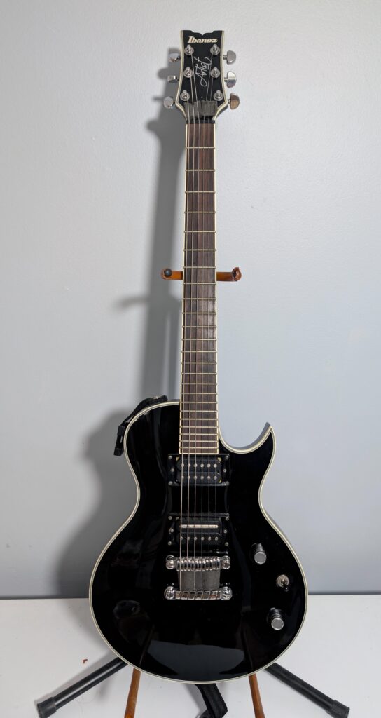 One of the few guitars I have that I got as a trade. Obviously I have a lot of RG style guitars, so when a friend offered to trade their ARZ400 for my RGAT62, I went for it. The RG was a great guitar, but I already had so many RGs, so adding a single cut to the collection was a good decision. It plays and sounds great, especially for lower tuned metal. It has Dimarzio Crunch Lab/D Sonic pickups in it.