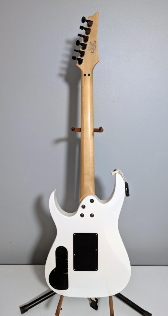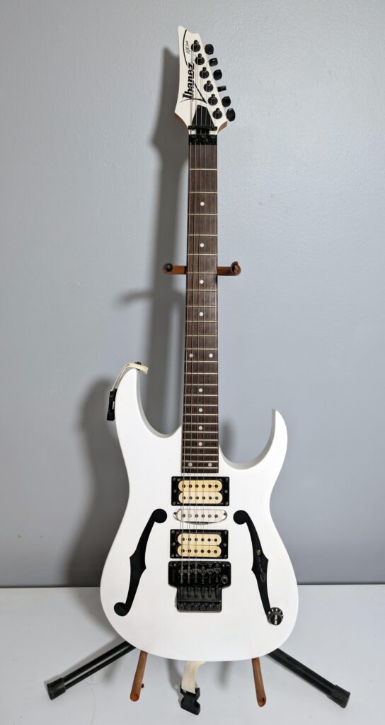 Being Paul Gilbert Signature, I could not pass up getting this guitar. I got this one the first week of my first semester of college. It was basically what I spent my first paycheck on. From what I can find, the PGM3 was never sold in the US, only in the Asian market. How it got here is a story I would love to know. That being said, it does seem to be valuable, but not as much as Paul Gilbert’s PGM30 or PGM300. The pickups are pretty okay, and the tremolo kinda sucks. I have it semi-blocked.