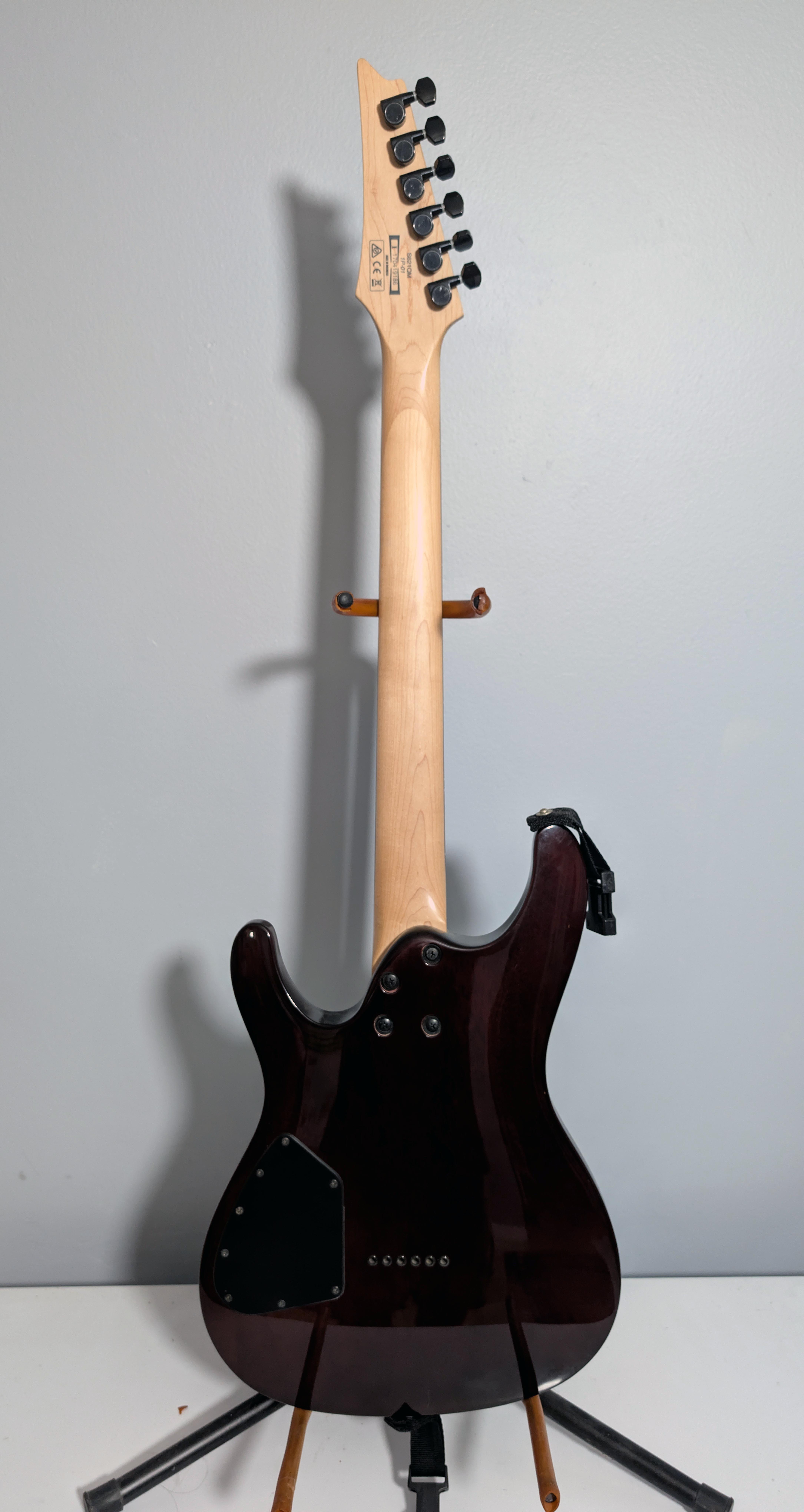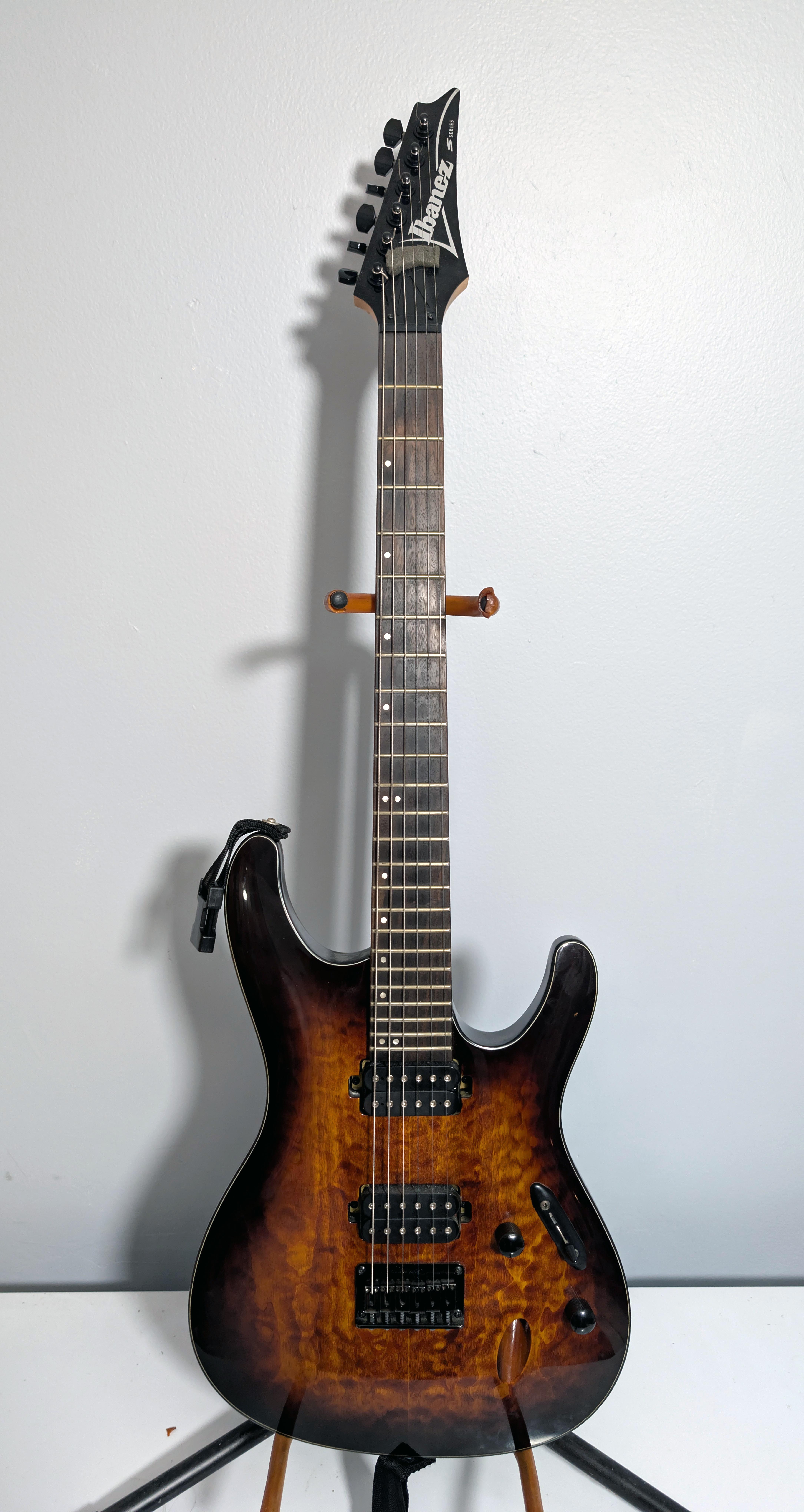 Ibanez S621QMModel: Ibanez S621QMPurchased: 2019-03-15Color: Dragons Eye BurstSerial: I170419186Made in: Indonesia | April 2017Pricing: $249.00 | Pawn Shop (Used)More InfoCommentsThis was a decent deal at a pawn shop, and it sounds great even in stock configuration. I have played it on quite a few songs of my own personal music. Being an S model, it weighs as much as a wet shirt and is incredibly ergonomic.